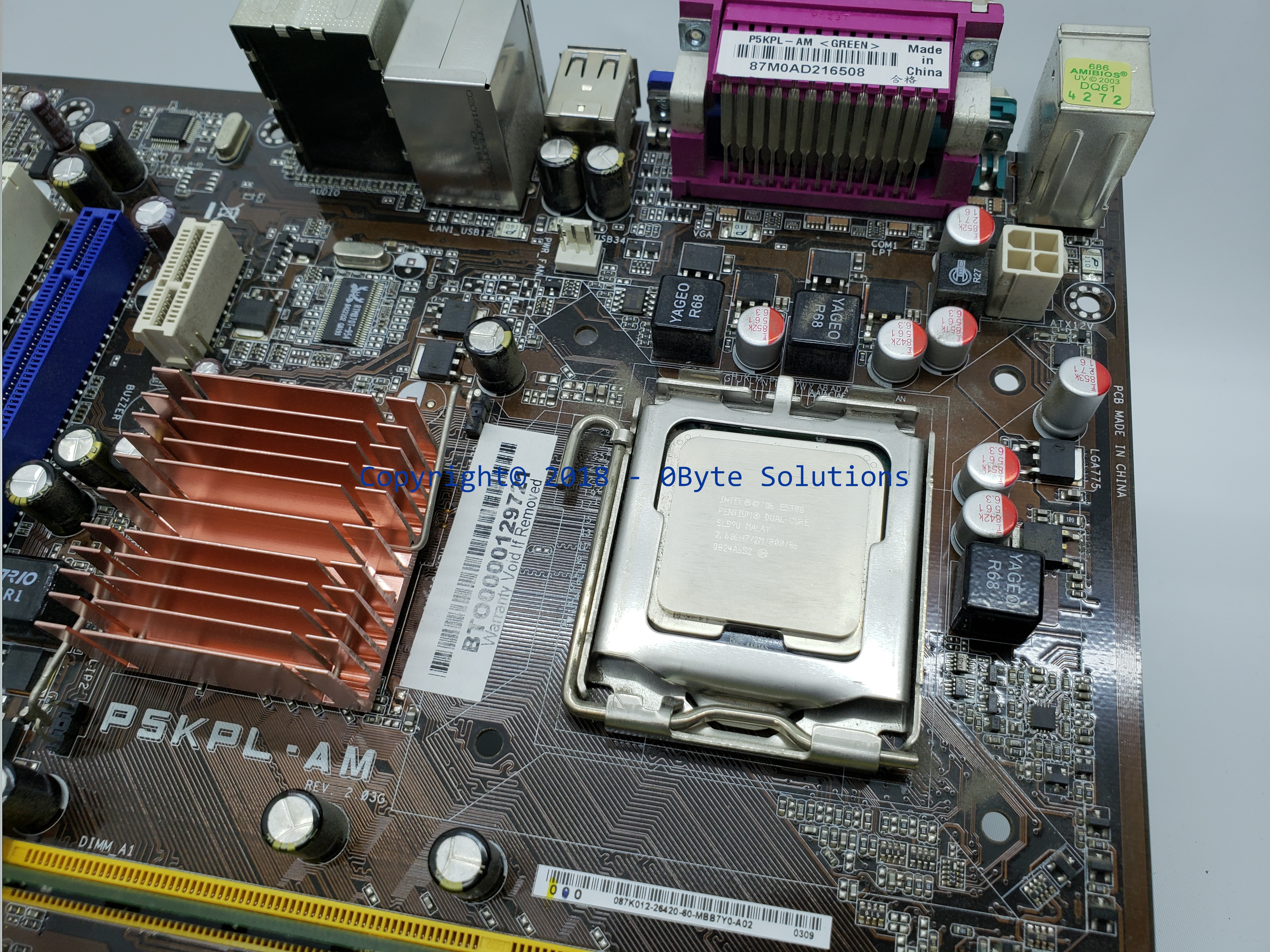 ***WORKING***/Used ASUS P5KPL-AM Mainboard with LGA775 (FC-LGA8) Pentium(R) Dual-Core SLB9U E5300 @ 2.60GHz CPU, 2 GBytes 333.3 MHz (PC2-5300) DDR2-SDRAM RAM & Case I/O Backplate