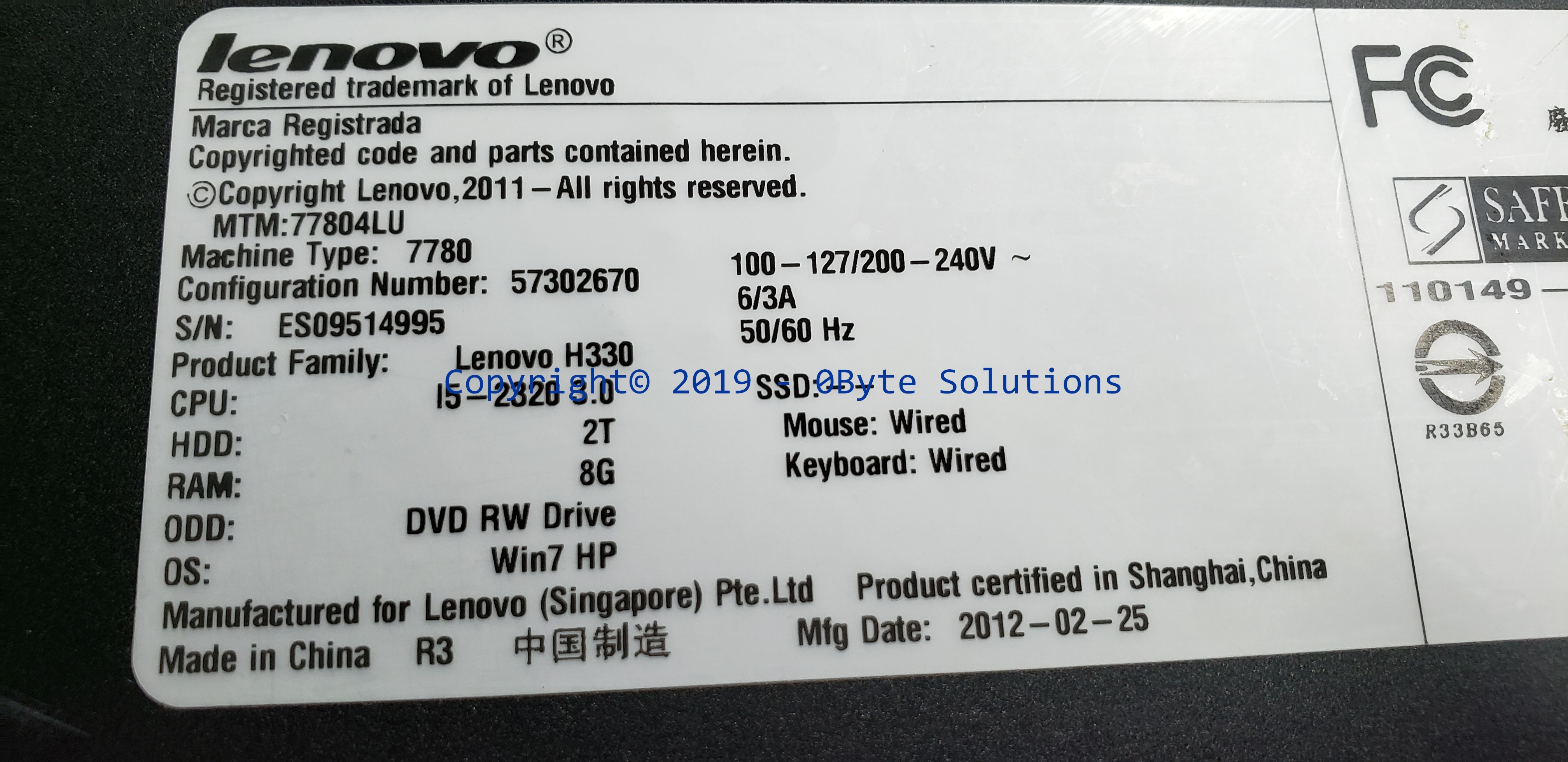 ***WORKING***/Used Lenovo CIH61C (Rev 1.1) Mainboard from a Lenovo H330 (7780-4LU) with Socket H2 (LGA1155) Intel(R) Core(TM) i5-2320 CPU @ 3.00GHz CPU, 8 GBytes DDR3 SDRAM 666.7 MHz (DDR3-1333 / PC3-10600) RAM & case I/O backplate (THIS MB WAS ACTIVATED WITH A WINDOWS 10 HOME DIGITAL LICENSE)